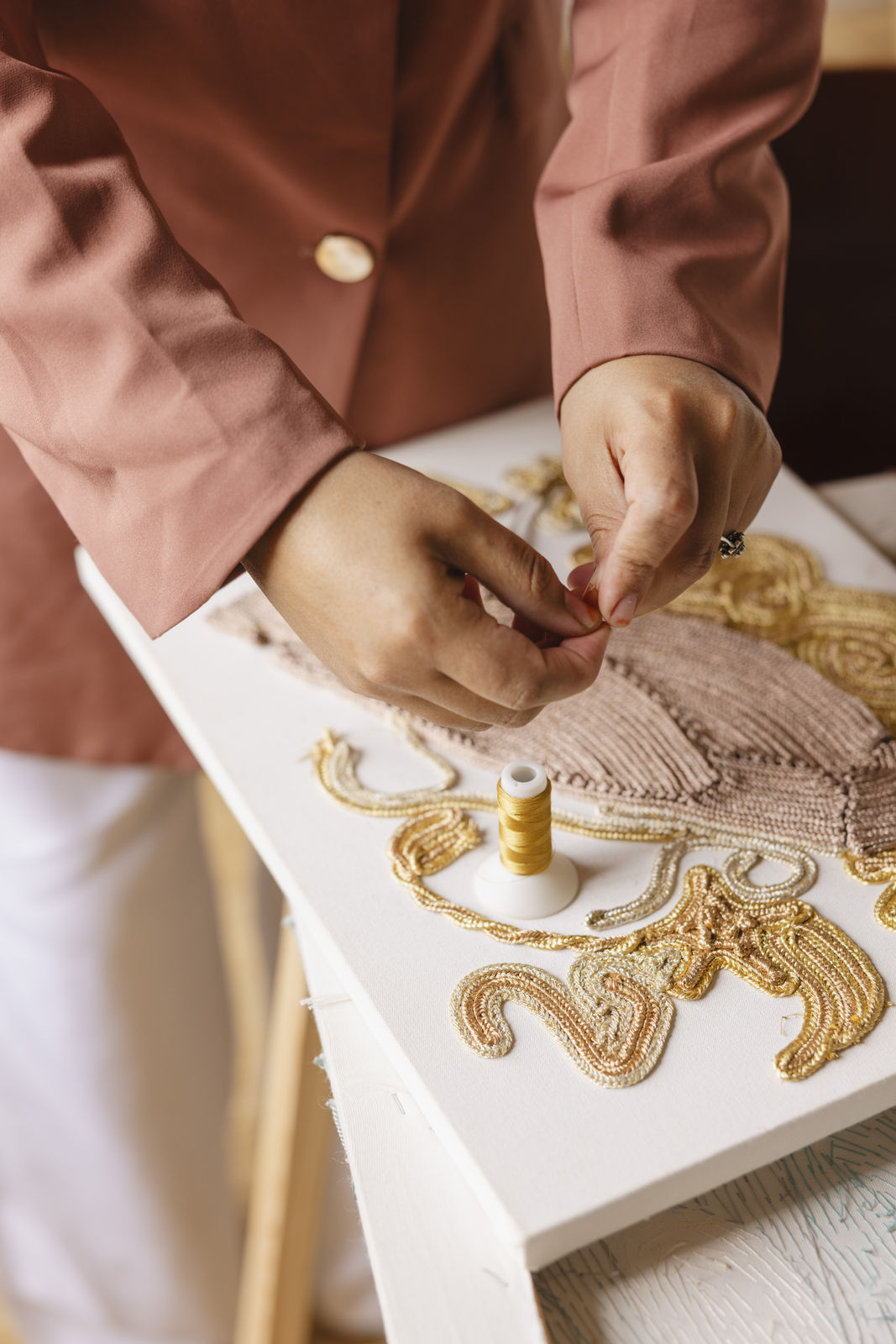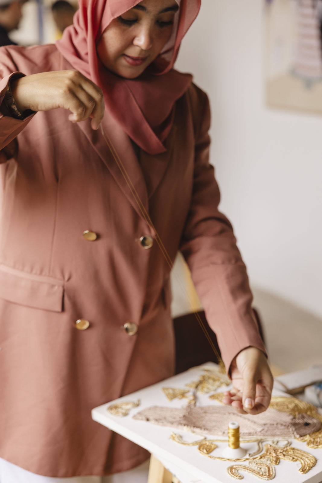 The embroiderers present sfiffa (these traditional braided trims) and sabra (Moroccan vegetable silk thread). You discover the textures, the colors, the possibilities.